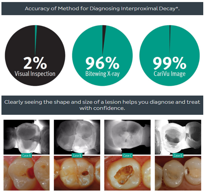 *Proximal dentin lesions represented in CariVu images correlate to the actual condition in the tooth with 99% accuracy. Study data on file. CariVu is a diagnostic aid for the detection of open or incipient carious lesions above the gingiva and for monitoring the progress of such lesions. Indications for use for CariVu are detection of: smooth surface caries, occlusal carries, proximal caries, initial caries, secondary caries, and cracks.